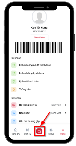 Bước 1: Sau khi nhận được thông báo có công nợ cần thanh toán, học sinh/sinh viên cần đăng nhập và truy cập danh sách công nợ tại app VL4U