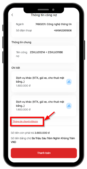 Để thanh toán các công nợ của mình, học sinh/sinh viên có thể thanh toán bằng phương thức chuyển khoản thông qua ứng dụng ngân hàng của mình. Các bước thanh toán sẽ được thực hiện như sau: