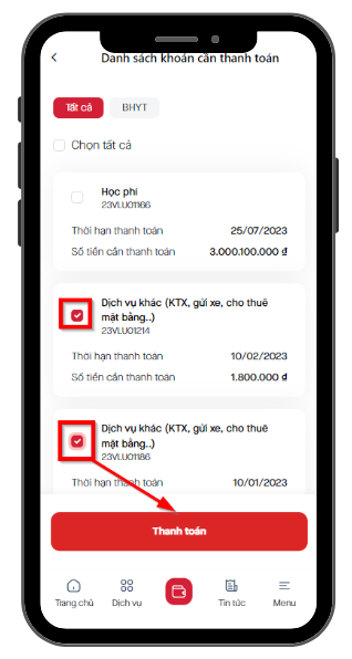 : Tại danh sách công nợ, học sinh/sinh viên chọn công nợ mà mình muốn thanh toán