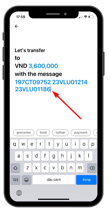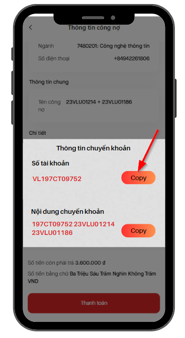 : Học sinh/sinh viên dán nội dung chuyển khoản vào app ngân hàng sau đó điền số tiền và xác nhận để chuyển khoản thanh toán